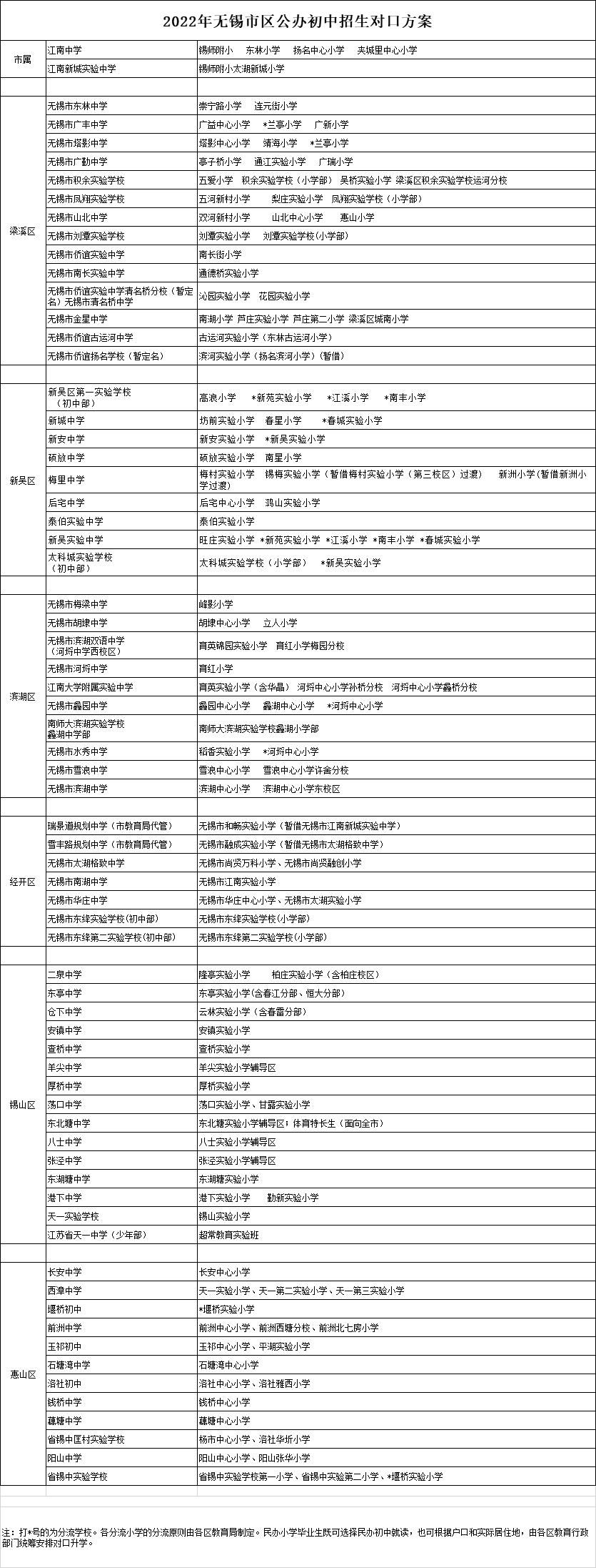 2022年无锡市区公办初中招生对口方案